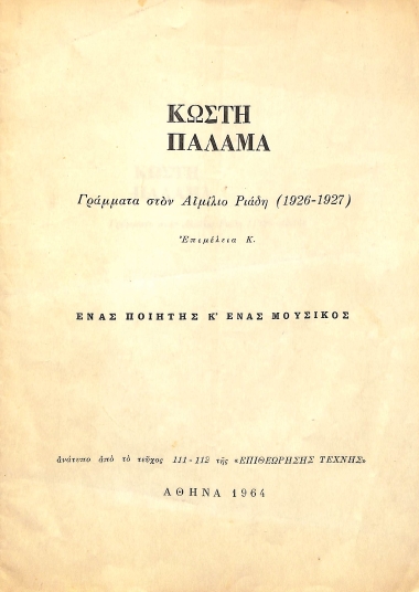 Γράμματα στον Αιμίλιο Ριάδη: "Ενας ποιητής κ' ένας μουσικός" (EL)