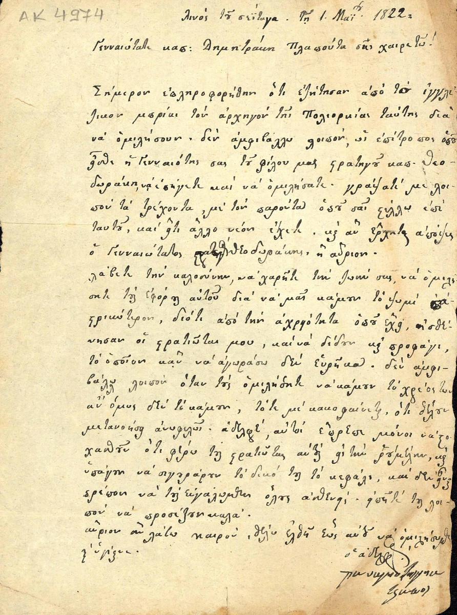 Επιστολή του Παναγιωτάκη Γιατράκου προς το Δ. Πλαπούτα 1-5-1822.