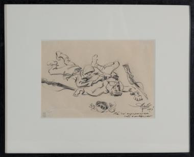 Με τα πυρομαχικά του σκοτωμένου, με κορνίζα.Διαστάσεων 18,5Χ22 εκατοστά.