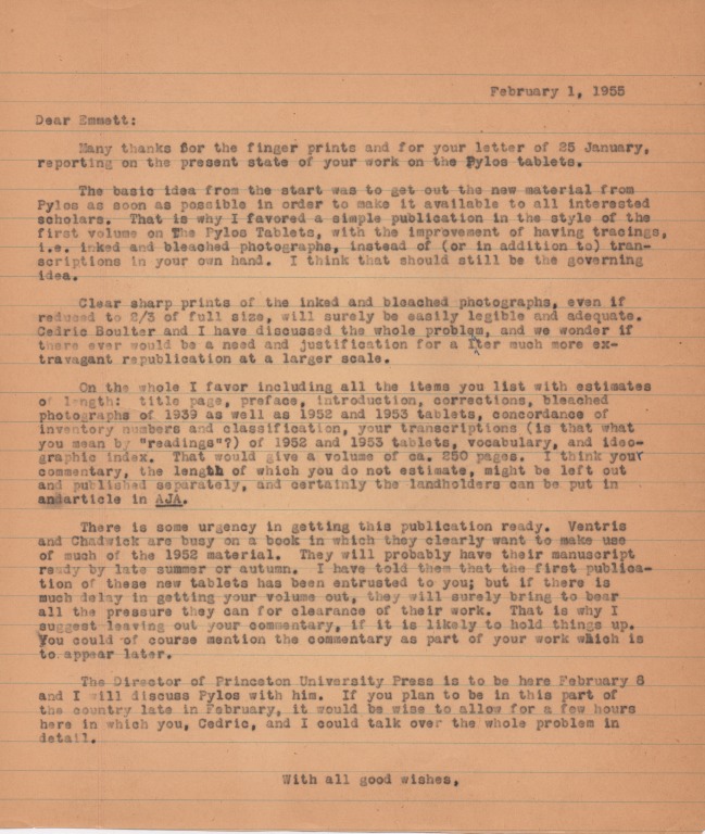 Επιστολή του Μπλέγκεν για την επίσπευση της έκδοσης των πινακίδων της Πύλου