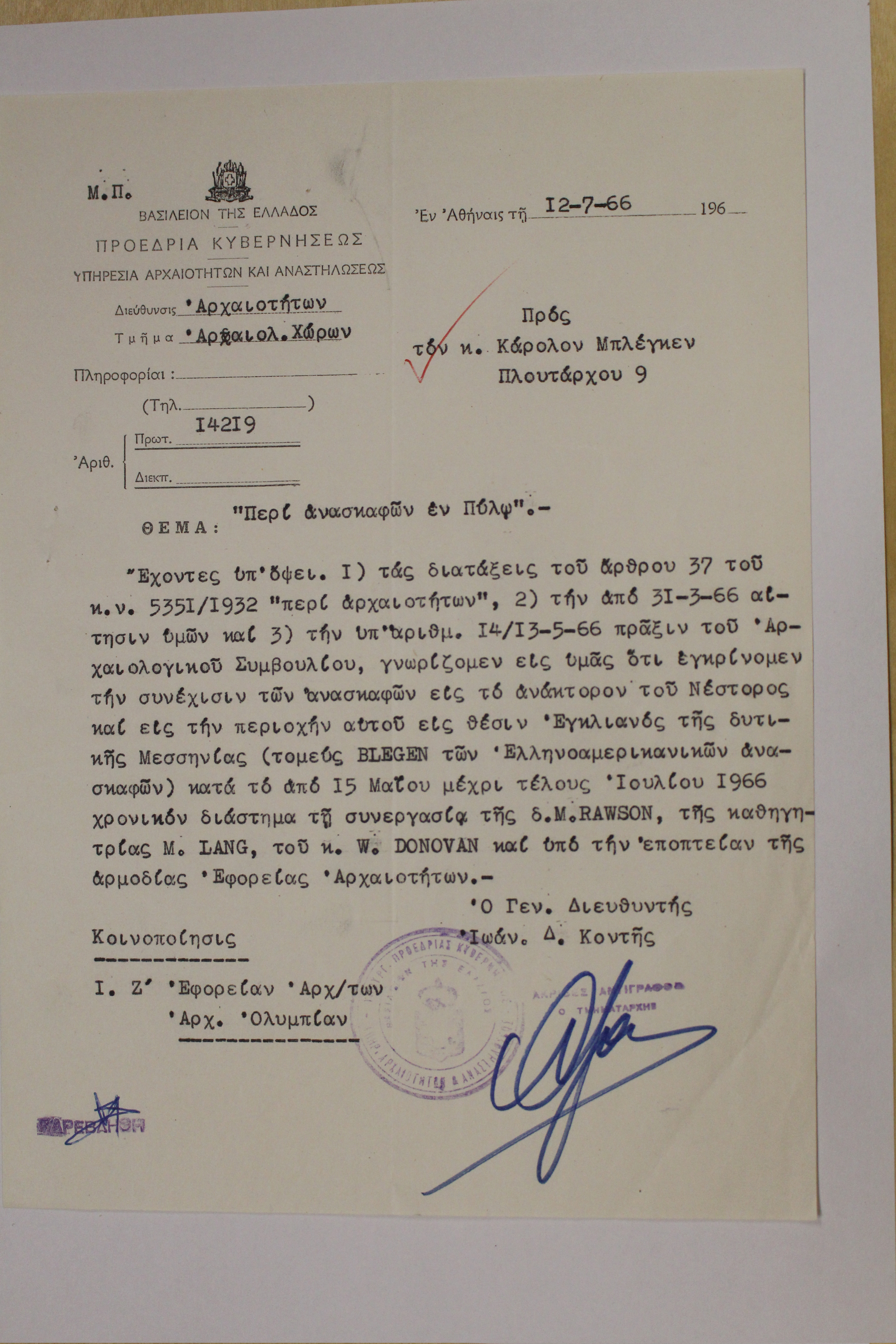 Εγκριτική επιστολή για τη συνέχιση των ανασκαφών το 1966