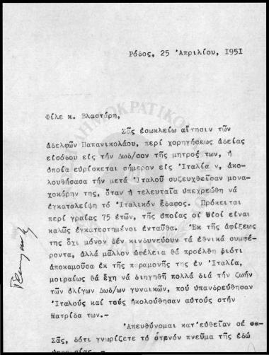 Αίτηση αδελφών Παπανικολάου περί χορήγησης άδειας εισόδου στα Δωδεκάνησα