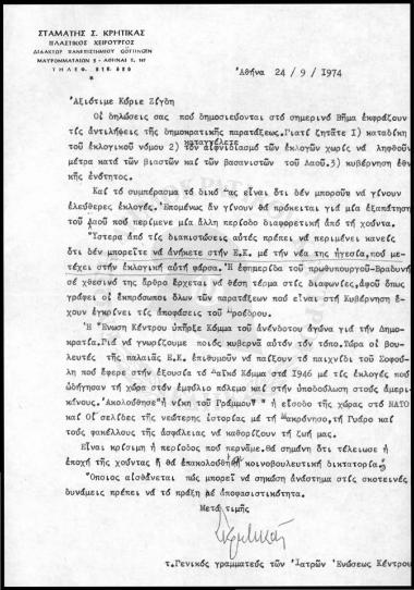 Αλληλογραφία Σταμάτη Σ. Κρητικά και Ι.Γ. Ζίγδη (1974)