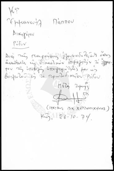 Εξουσιοδότηση δικηγόρου Εμμανουήλ Πάππου για υποβολή υποψηφιότητας Ιάκωβου Μ. Χατζημιχάλη