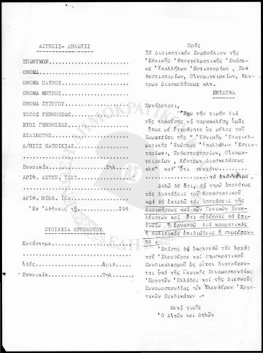 Αίτηση μέλους Ένωσης Υπαλλήλων Εστιατορίων και Κέντρων Διασκεδάσεως