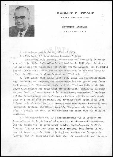 Βιογραφικό Σημείωμα τέως Υπουργού Ι.Γ. Ζίγδη (1974)