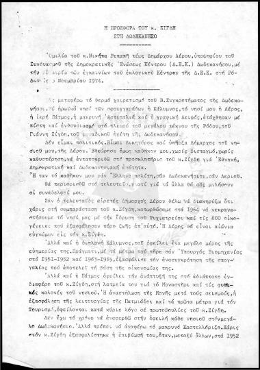 Ομιλία Νικήτα Ρεπαπή στα εγκαίνια του Δ.Ε.Κ. στη Ρόδο περί της προσφοράς του Ζίγδη