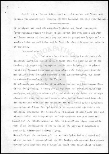 Ομιλία Ιωάννη Ν. Παραγυιού στα εγκαίνια του Εκλογικού Κέντρου Δ.Ε.Κ Ρόδου