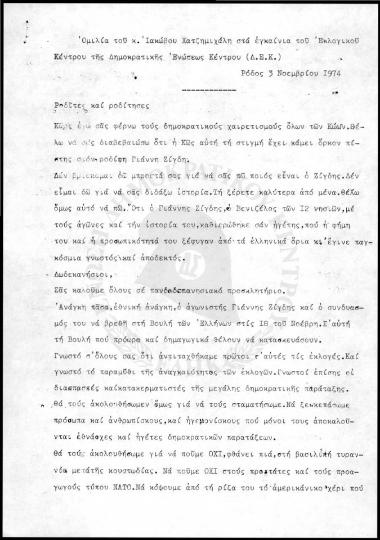 Ομιλία Ιάκωβου Χατζημιχάλη στα εγκαίνια της Δ.Ε.Κ. Ρόδου (1974)