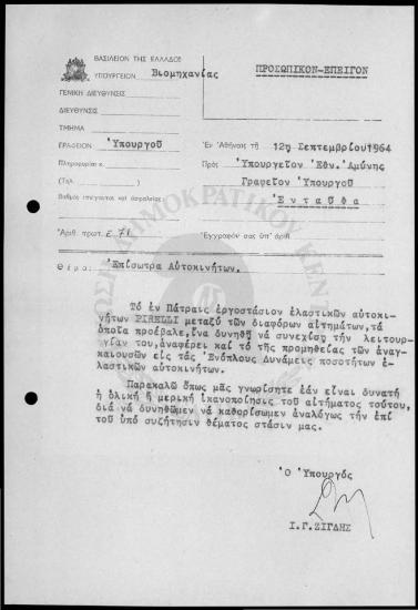 Αλληλογραφία του Υπουργείου Εθνικής Άμυνας με το Υπουργείο Βιομηχανίας - 12/09/1964