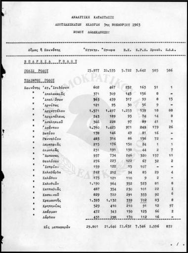 Αναλυτική Κατάσταση Αποτελεσμάτων Εκλογών της 3ης Νοεμβρίου 1963 Νομού Δωδεκανήσου