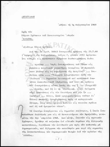 Επιστολή προς τον Πρύτανη του Πανεπιστημίου Αθηνών από τον Ιωάννη Πεσμαζόγλου (1969)