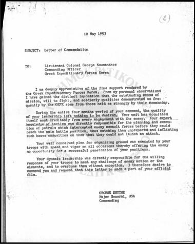 Letter of Commendation to Colonel G. Koumanakos-(Πόλεμος Κορέας)