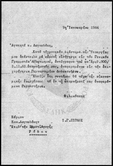 Αθλητικά θέματα Δωδεκανήσου-Υπόμνημα προς Ι.Γ Ζίγδη για επιχορηγήσεις Δημοτικών Γυμναστηρίων