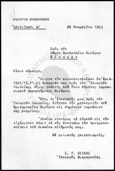 Επιστολή Ι.Γ Ζίγδη προς Δήμαρχο Μανδρακίου Νισύρου (1963)