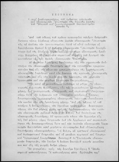 Υπόμνημα περί της αναδιοργανώσεως του τμήματος Πολιτικών και Οικονομικών Επιστημών της Νομικής Σχολής του ΕΚΠΑ