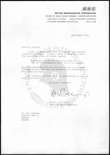 Συνέντευξη Ι.Γ. Ζίγδη προς τον Διευθυντή του Ελληνικού Προγράμματος του B.B.C Έ. Γουίλλιαμς (1973)