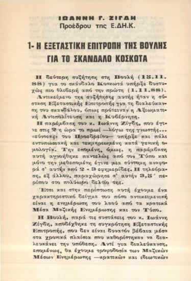 Η Εξεταστική Επιτροπή της Βουλής για το σκάνδαλο Κοσκωτά του Ιωάννη Ζίγδη Προέδρου της ΕΔΗΚ