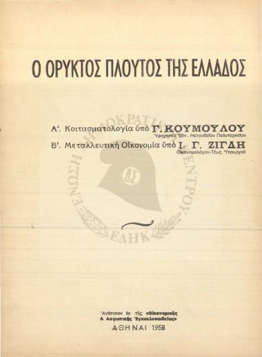 Ο Ορυκτός πλούτος της Ελλάδος Α' Κοιτασματολογία υπό Γ. Κούμουλο Β' Μεταλλευτική Οικονομία υπό Ι. Γ. Ζίγδη