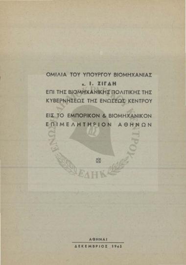 Ομιλία του Υπουργού Βιομηχανίας Ι.Γ. Ζίγδη επί της Βιομηχανικής Πολιτικής της Κυβερνήσεως της Ενώσεως Κέντρου εις το Εμπορικό και Βιομηχανικό Επιμελητήριον Αθηνών