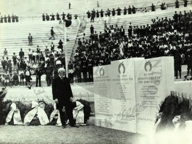 Ο Ελ. Βενιζέλος στο Παναθηναϊκό Στάδιο μπροστά σε μαρμάρινες στήλες αφιερωμένες σε Ήρωες και ευεργέτες