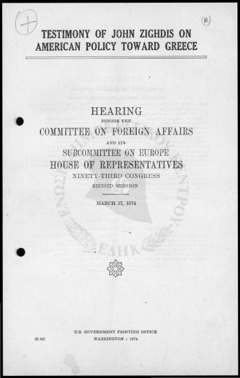 Testimony of John Zighdis on American policy toward Greece-Hearing before the committee on foreign affairs and its subcommittee on Europe House of Representatives