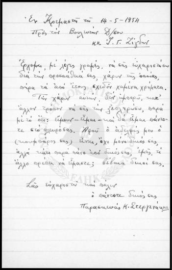 Αλληλογραφία Ι.Γ. Ζίγδη - Αιτήματα (1954)
