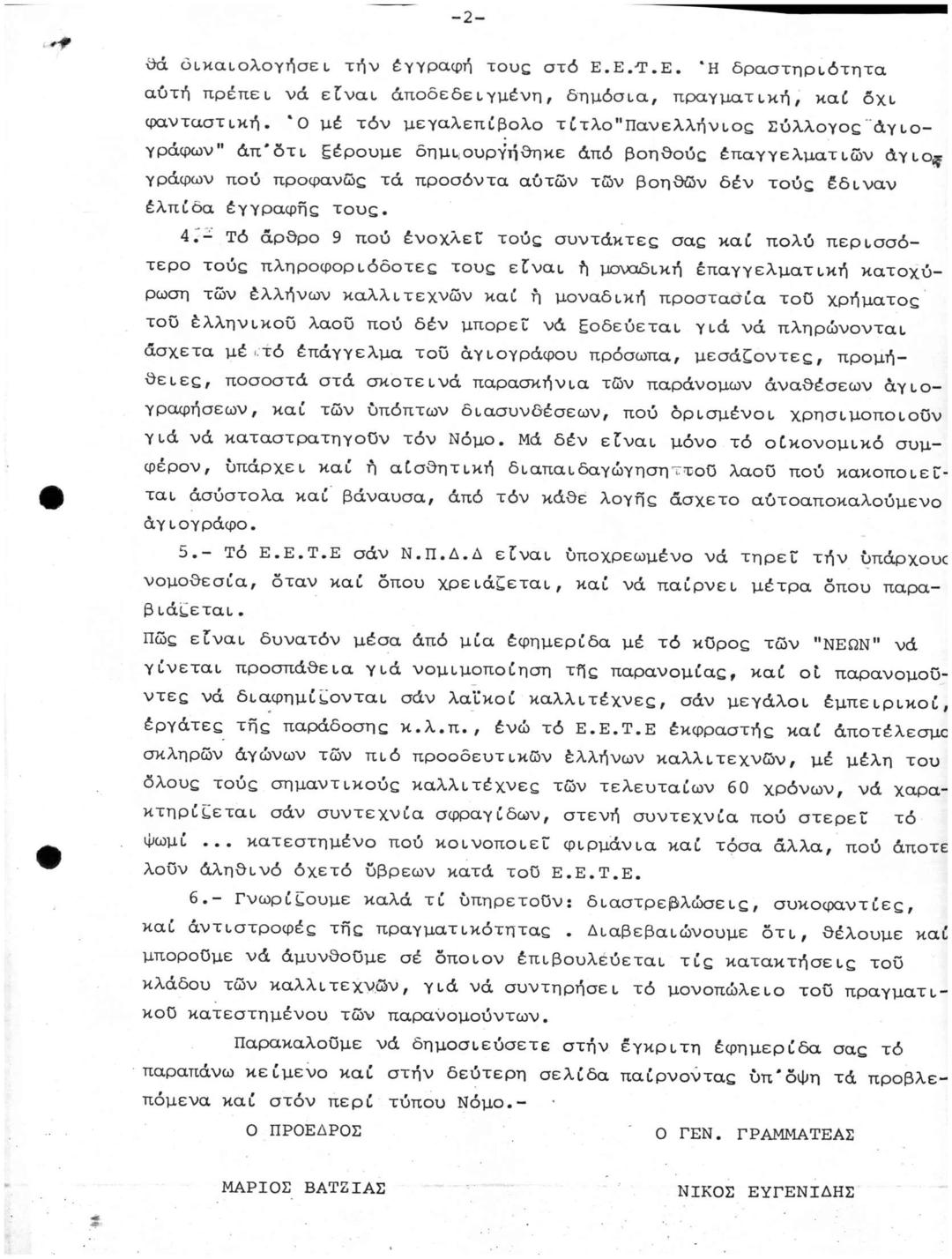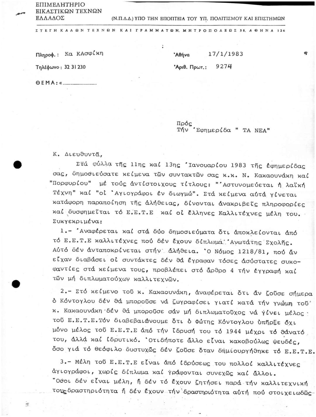 Περι Δημοσιευμένων Άρθρων στην Εφημερίδα "Τα Νέα" με Τίτλους "Αστυνομεύεται η Λαϊκή Τέχνη" και "Οι Αγιογράφοι εν Διωγμώ"
