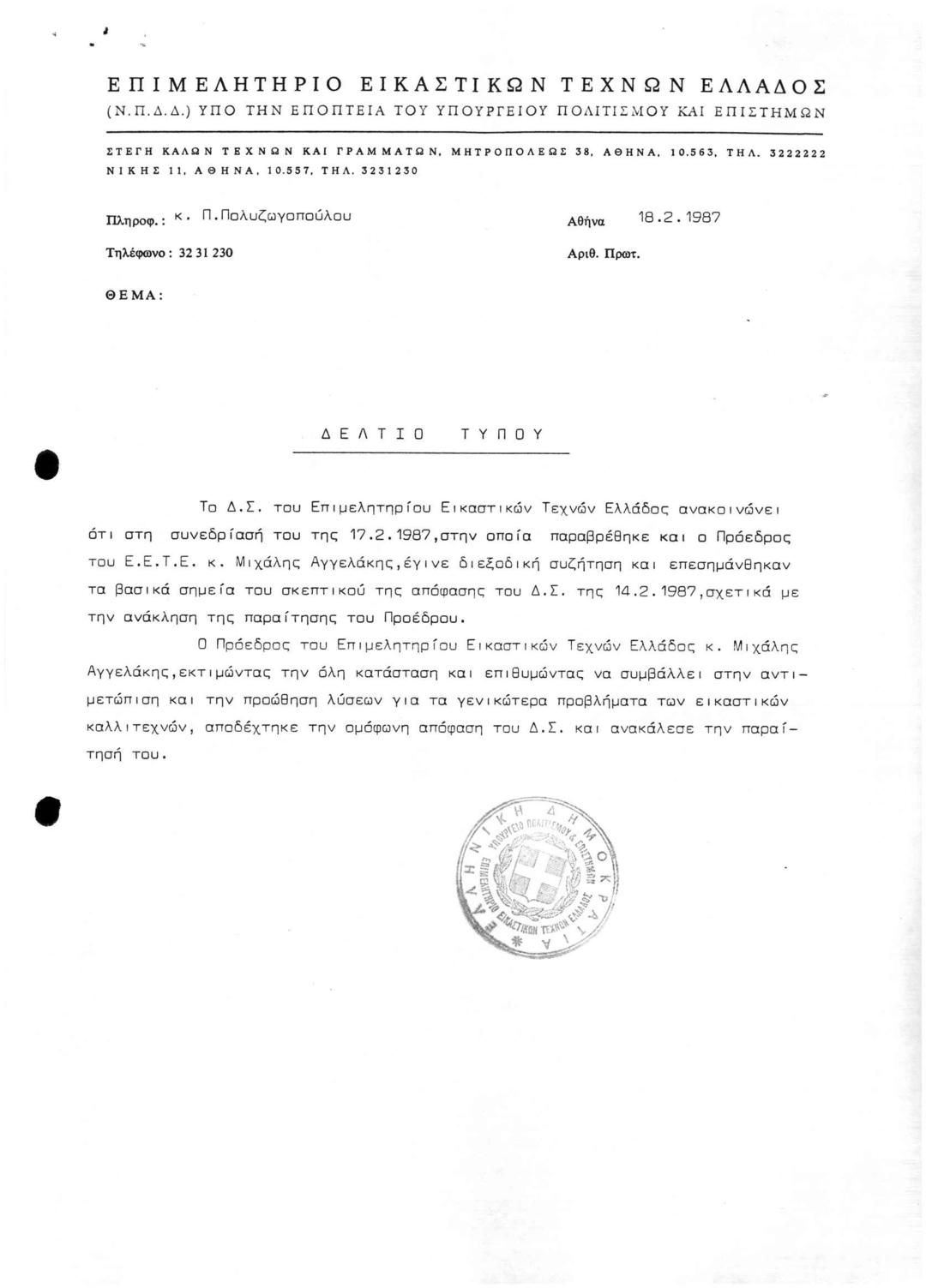 Περί Ανάκλησης Παραίτησης του Προέδρου ΕΕΤΕ