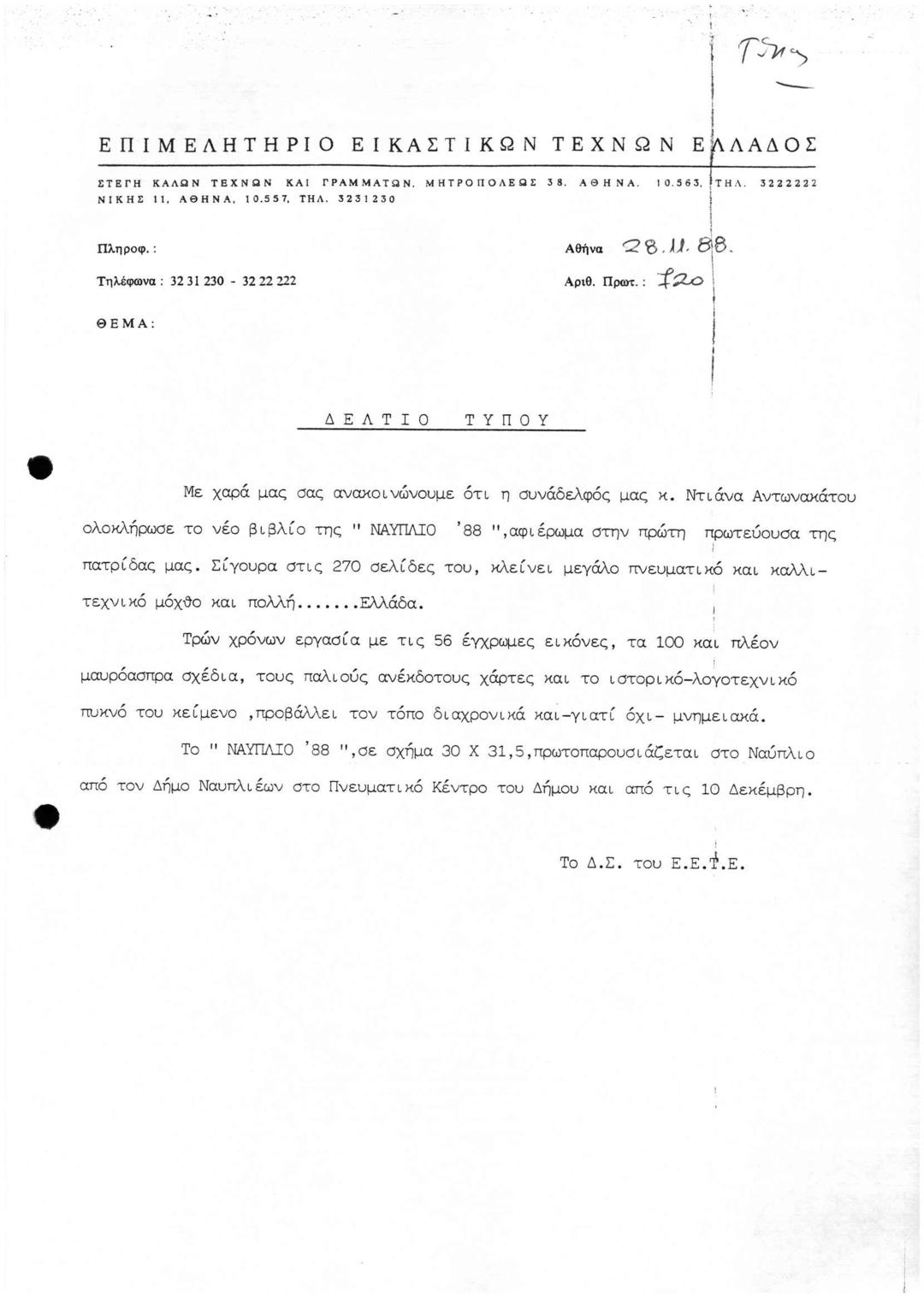 Περι Νέου Βιβλίου με Τίτλο "Ναύπλιο '88" της Αντωνακάτου Ντιάνας