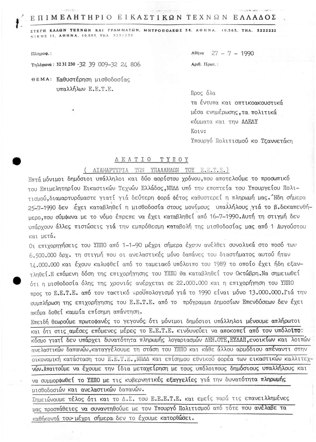 Καθυστέρηση Μισθοδοσίας Υπαλλήλων ΕΕΤΕ