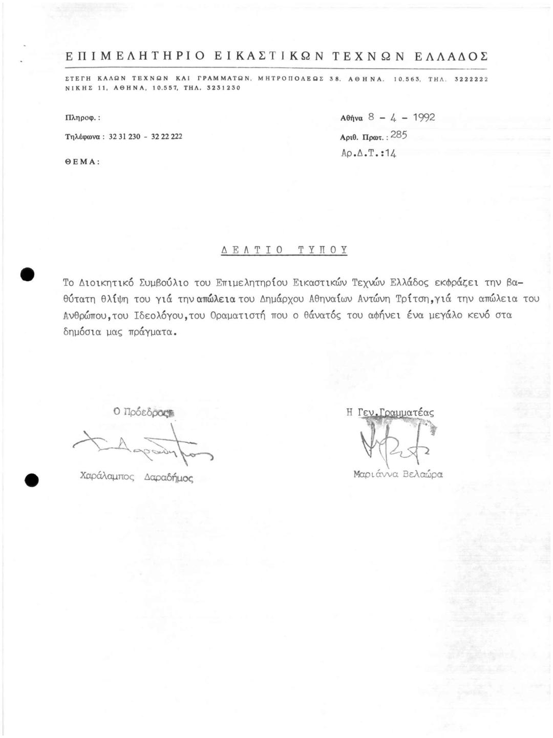 Συλλυπητήριο για την Απώλεια του Δημάρχου Αθηναίων Τρίτση Αντώνη
