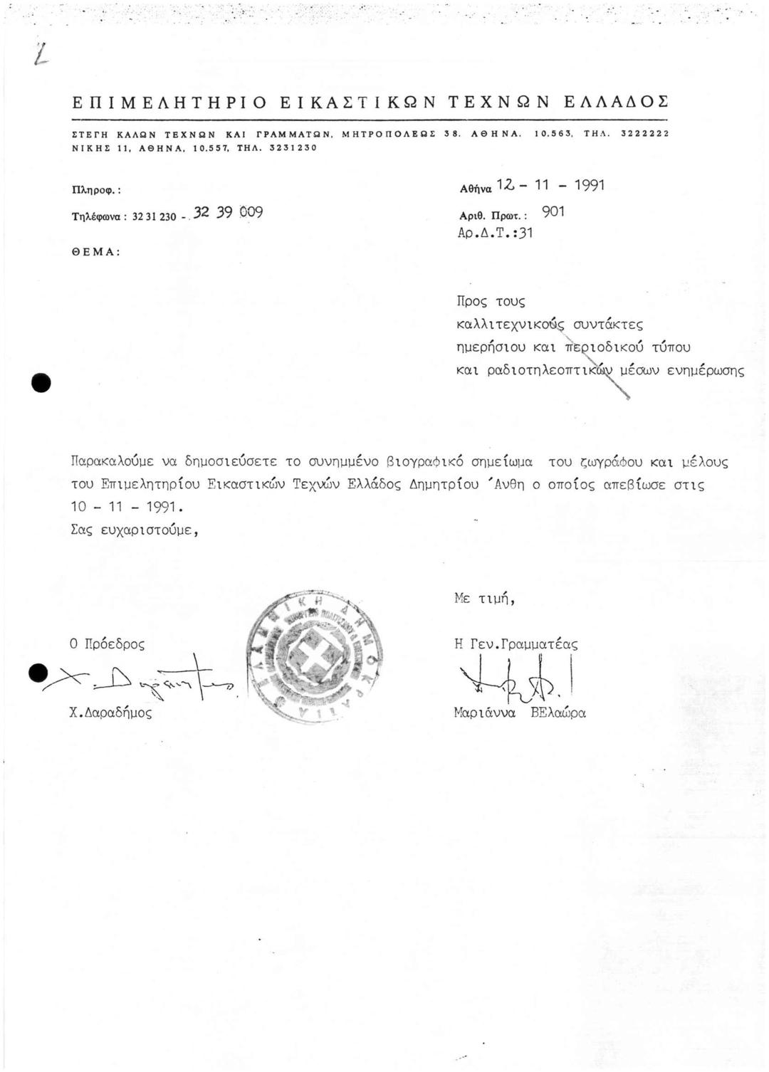 Συλλυπητήριο για τον Θανάτου του Δημητρίου Άνθη