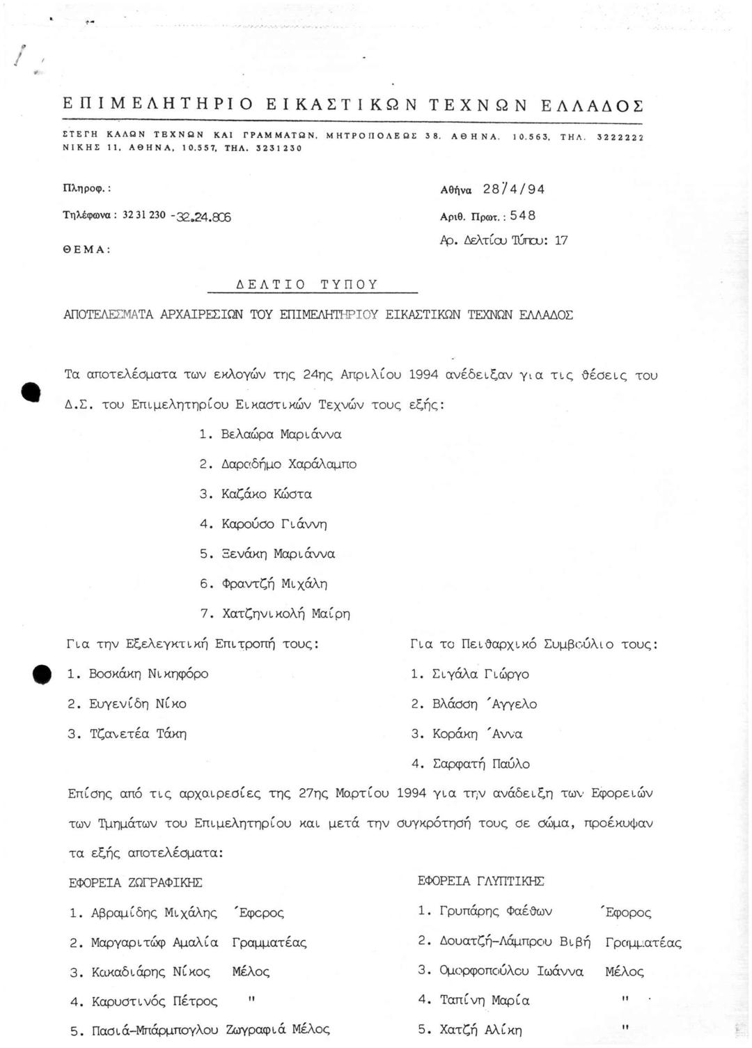 Αποτελέσματα Αρχαιρεσιών ΔΣ, Εξελεγκτικής Επιτροπής, Πειθαρχικού Συμβουλίου και Εφοριών ΕΕΤΕ