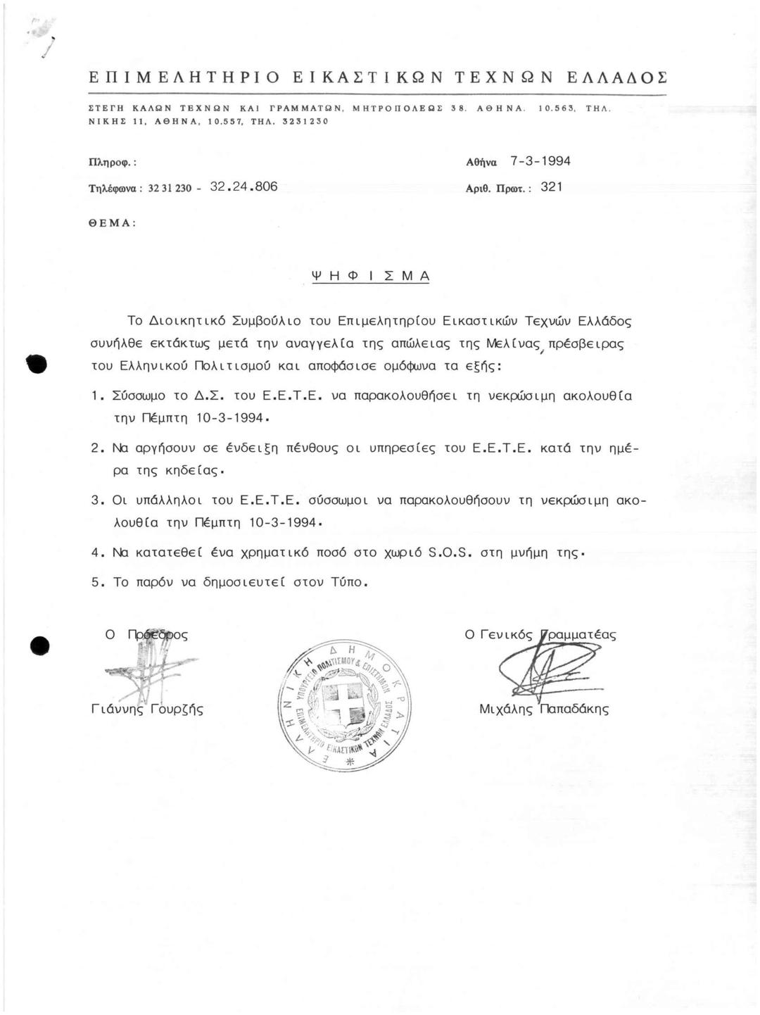 Ψήφισμα ΕΕΤΕ για Απώλεια Μελίνας Μερκούρη