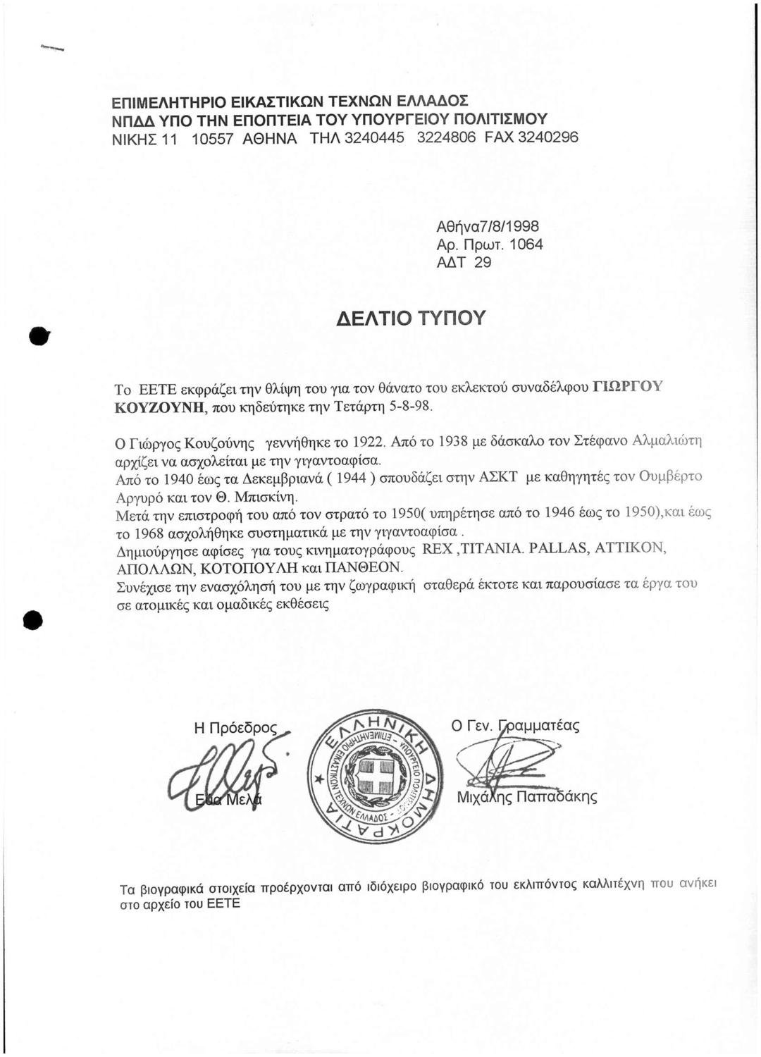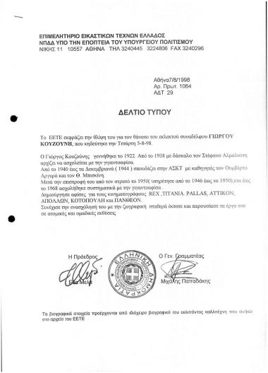 Το ΕΕΤΕ Εκφράζει την Θλήψη του για τον Θάνατο του Συναδέλφου Γιώργου Κουζούνη