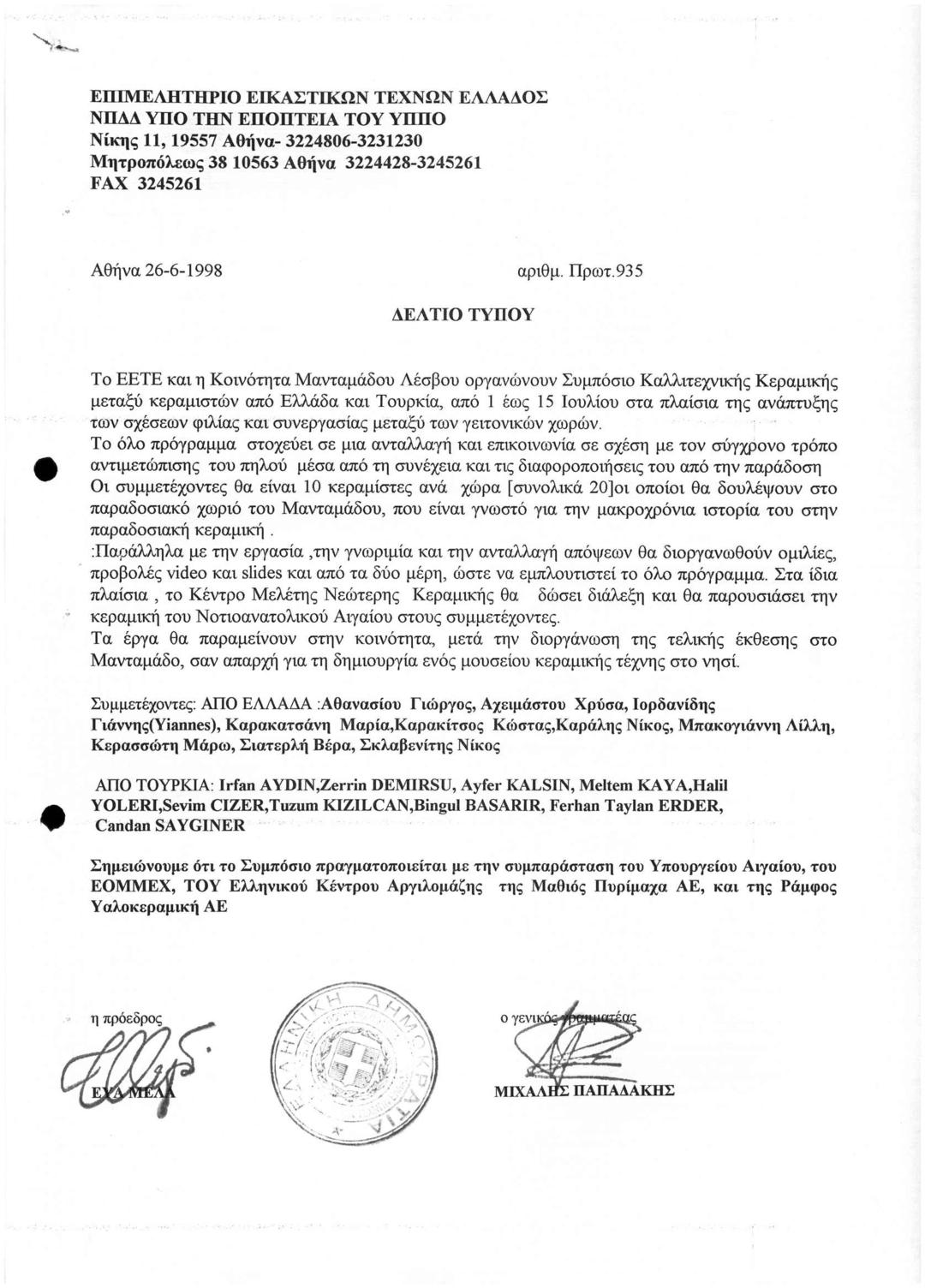 Συμπόσιο Καλλιτεχνικής Κεραμικής Μεταξύ Κεραμιστών απο Ελλάδα και Τουρκία στην Κοοινότητα Μανταμάδου στην Λέσβο