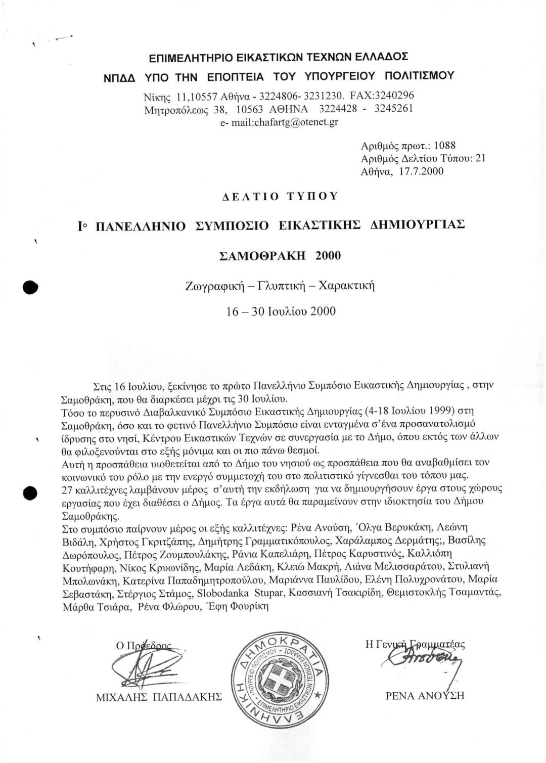 1ο Πανελλήνιο Συμπόσιο Εικαστικής Δημιουργίας Σαμοθράκη 2000