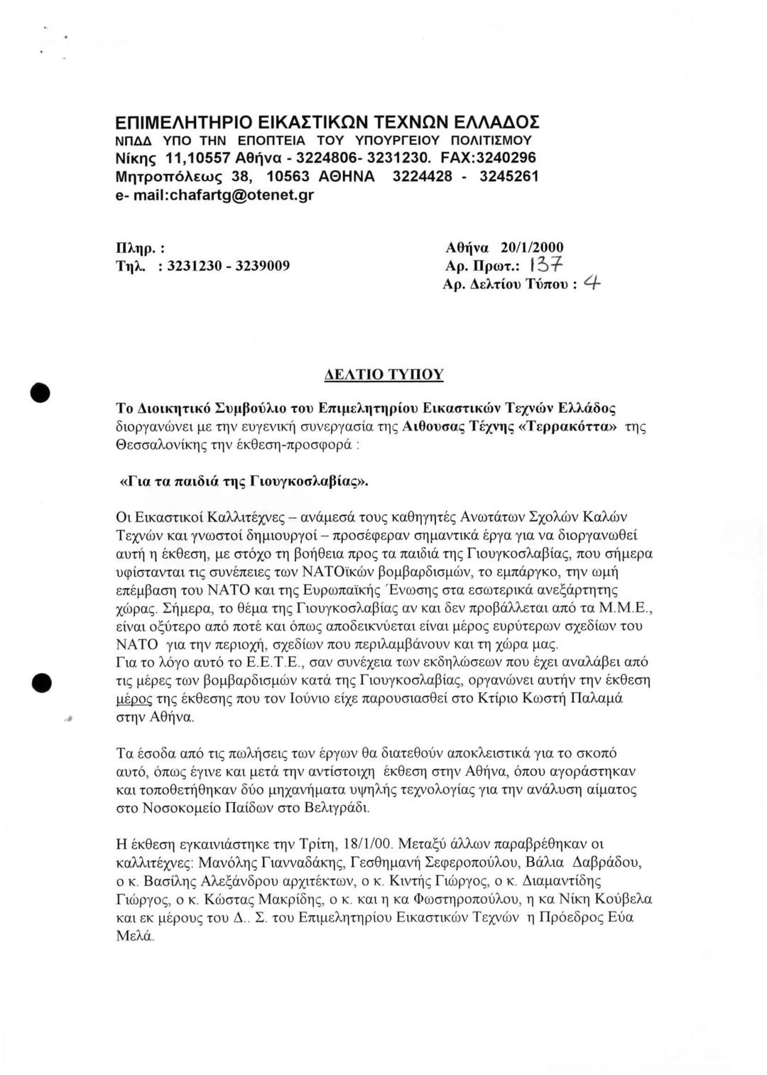 Εκθεση - Προσφορά "Για τα Παιδιά της Γιουγκοσλαβίας"