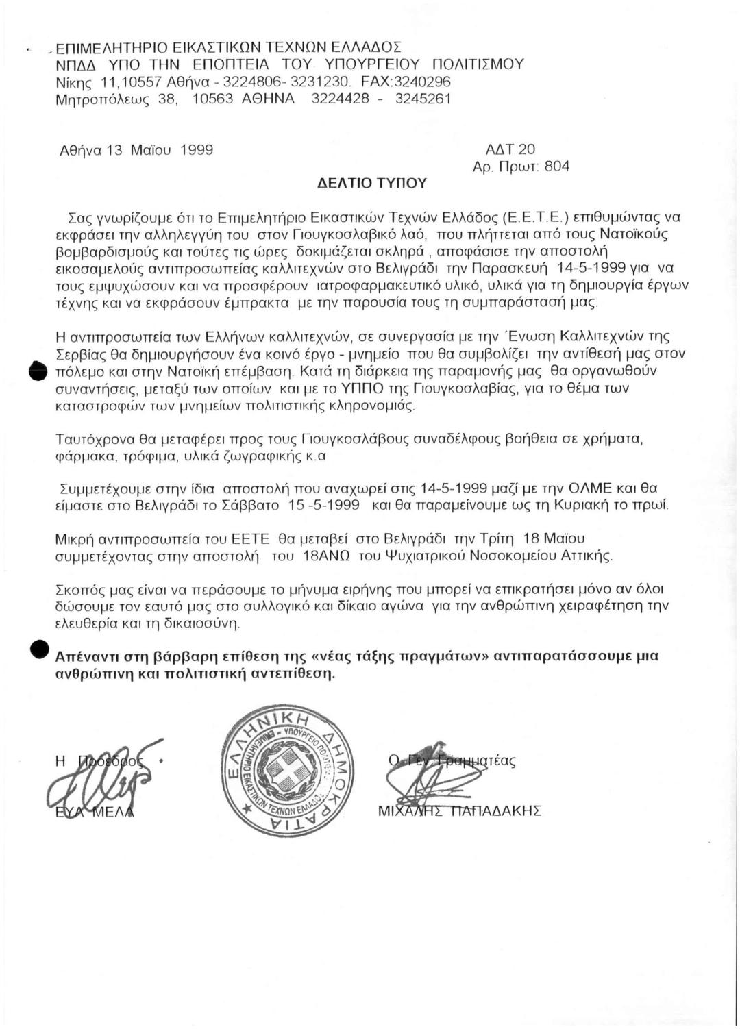 Αποστολή Εικοσαμελούς Αντιπροσωπείας Καλλιτεχνών στο Βελιγράδι - Αλληλεγγύη στον Γιουγκοσλαβικό Λαό