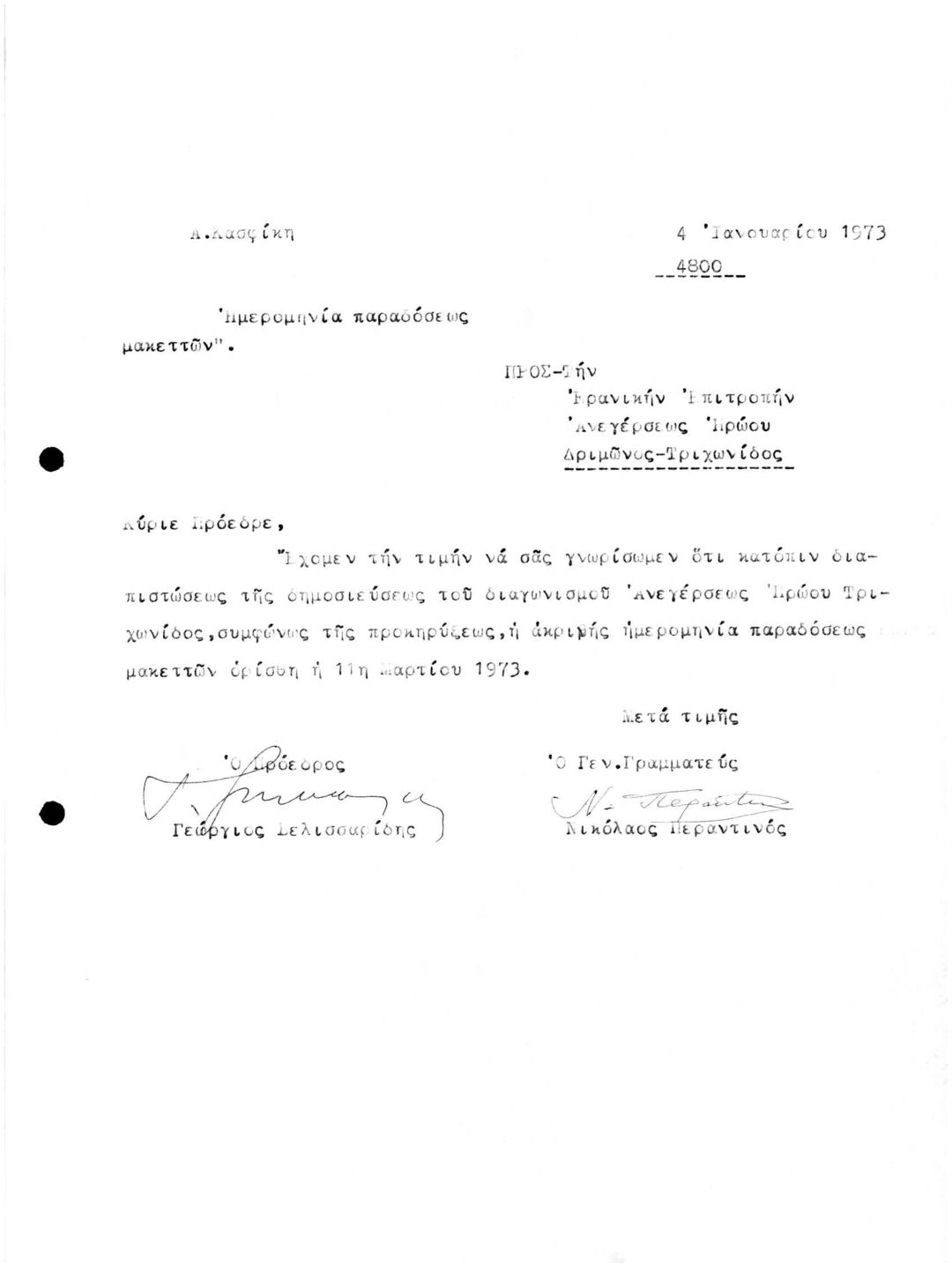 Ημερομηνία Παραδόσης Μακετών Διαγωνισμού Ανέγερσης Ηρώου Τριχωνίδας