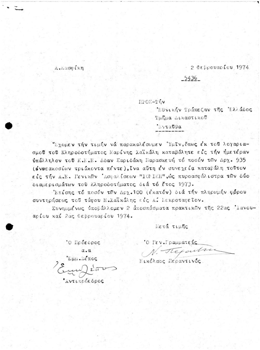 Περι Καταβολής Χρηματικού Ποσού απο το Κληροδότημα Μαρίνας Χαϊκάλη απο την Εθνική Τράπεζα της Ελλάδος