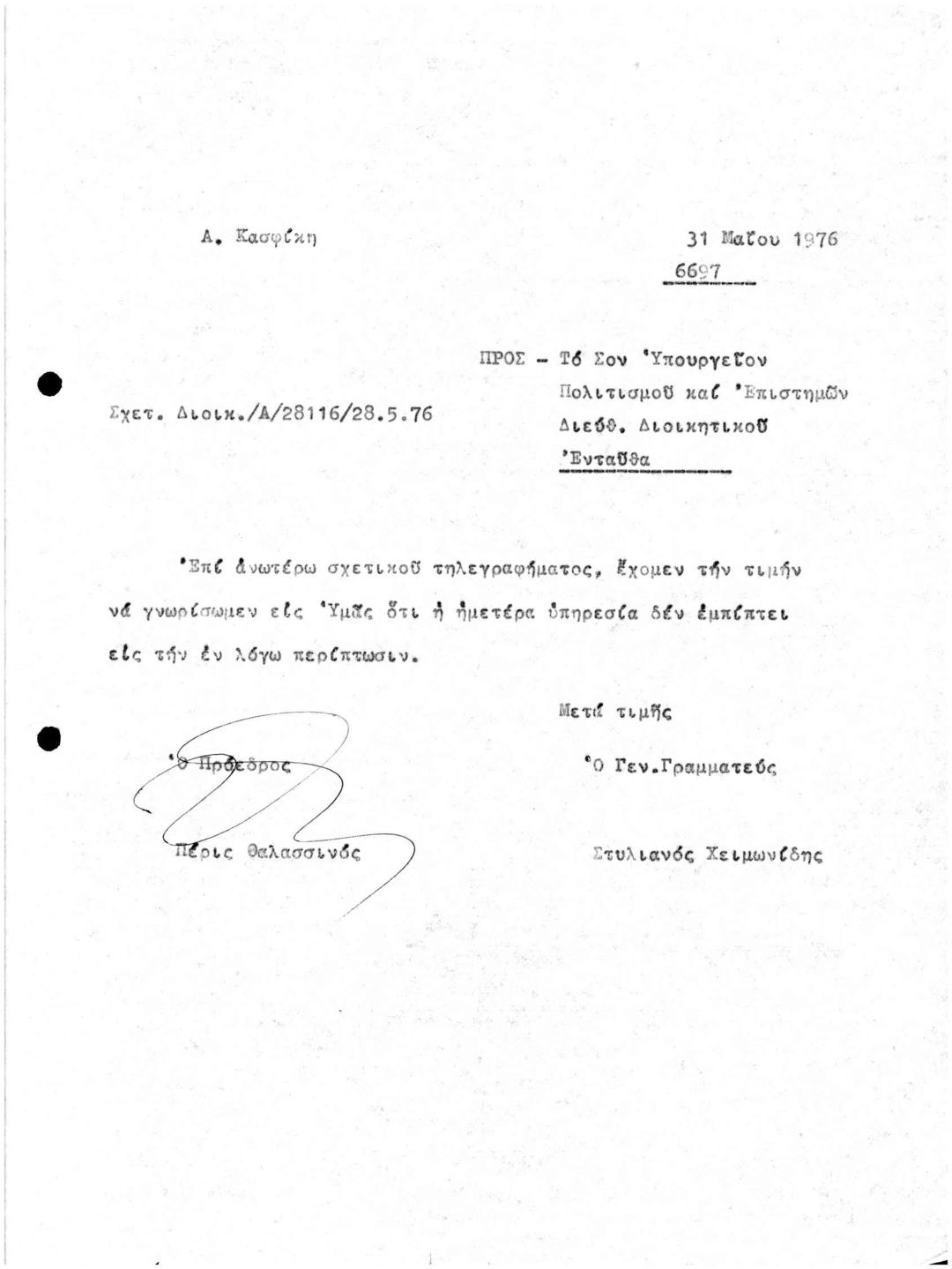 Επιστολή προς το Υπουργείο Πολιτισμού και Επιστημών: Σχετ. Διοικ. Α/28116/28.5.1976