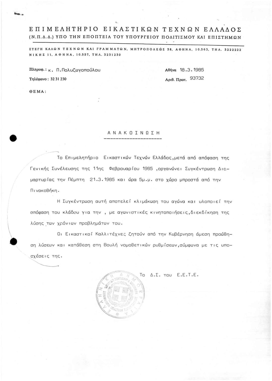 Περι Οργάνωσης Συγκέντρωσης Διαμαρτηρίας Κατόπιν Απόφασης της Γενικής Συνέλευσης του ΕΕΤΕ