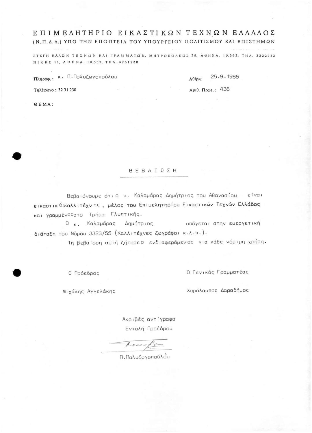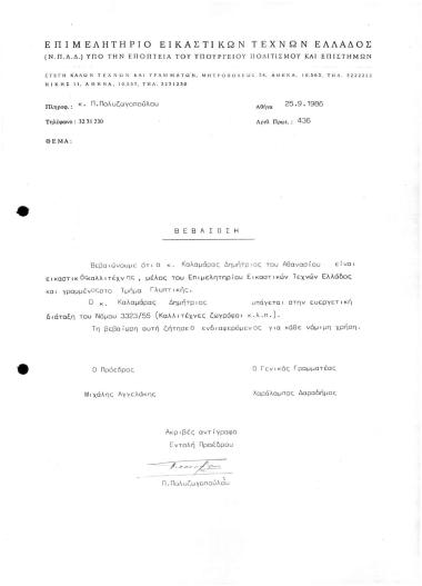 Βεβαίωση Μέλους ΕΕΤΕ Τμήματος Γλυπτικής