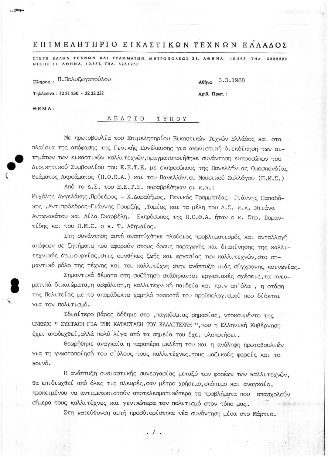 Περι Συνάντησης Εκπροσώπων του ΔΣ του ΕΕΤΕ με Εκπροσώπους της Πανελλήνιας Ομοσπονδίας Θεάματος Ακροάματος και του Πανελλήνιου Μουσικού Συλλόγου