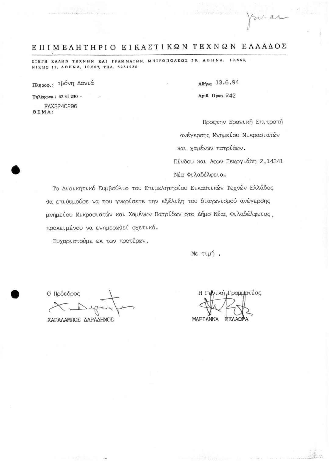 Περι Αιτήματος Ενημέρωσης για την Εξέλιξη Διαγωνισμού Ανέγερσης Μνημείου στο Δήμο Νέας Φιλαδέλφειας