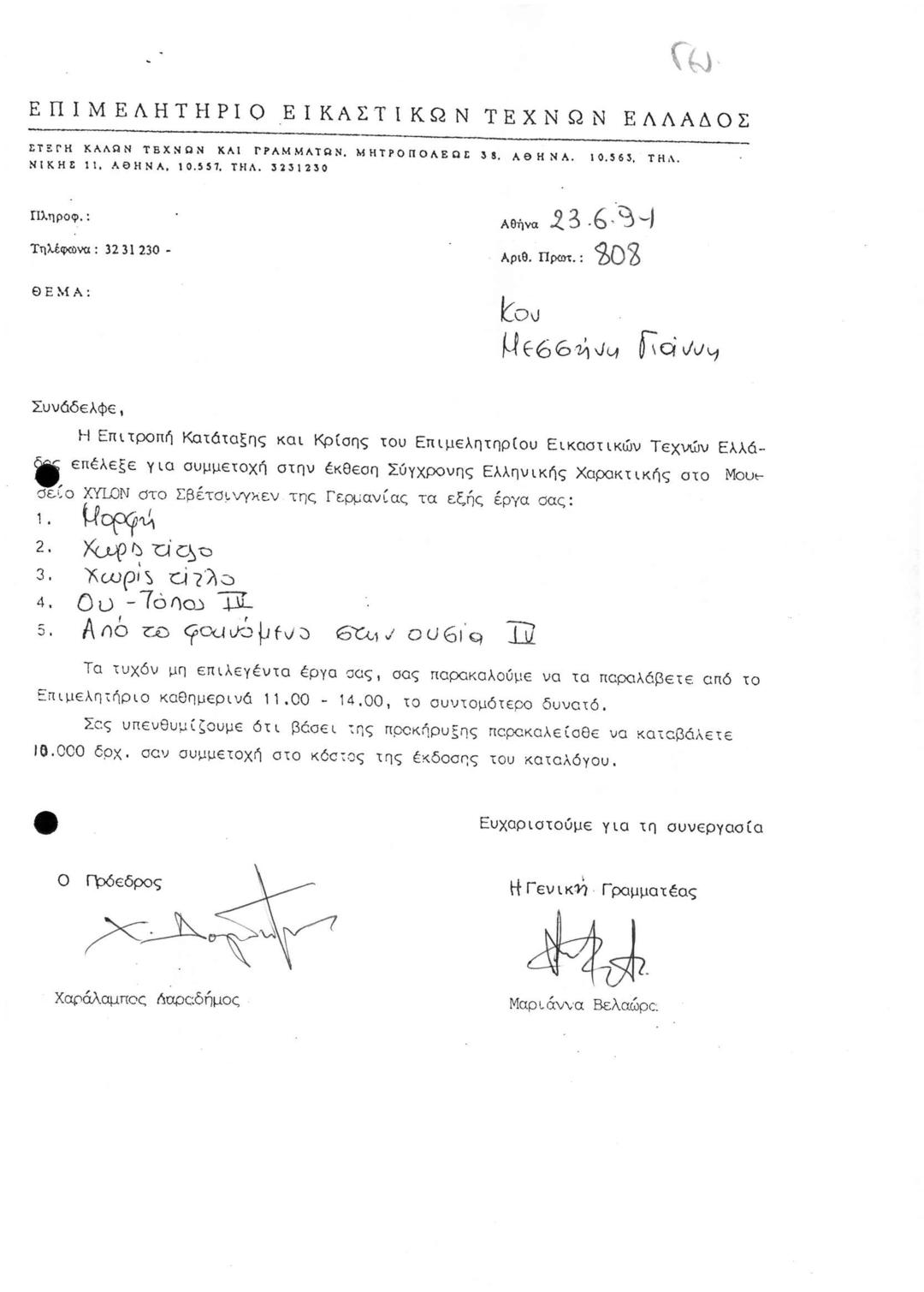 Περι Επιλογής Έργων Μέλους του ΕΕΤΕ για Συμμετοχή στην Έκθεση Σύγχρονη Ελληνική Χαρακτική στο Μουσείο XYLON