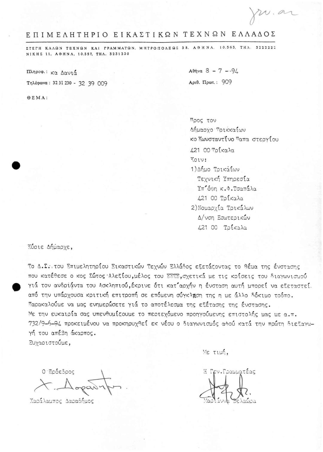 Περι Ένστασης Μέλους του ΕΕΤΕ Σχετικά με τις Κρίσεις Διαγωνισμού Ανδριάντα Ασκληπιού στο Δήμο Τρικάλων