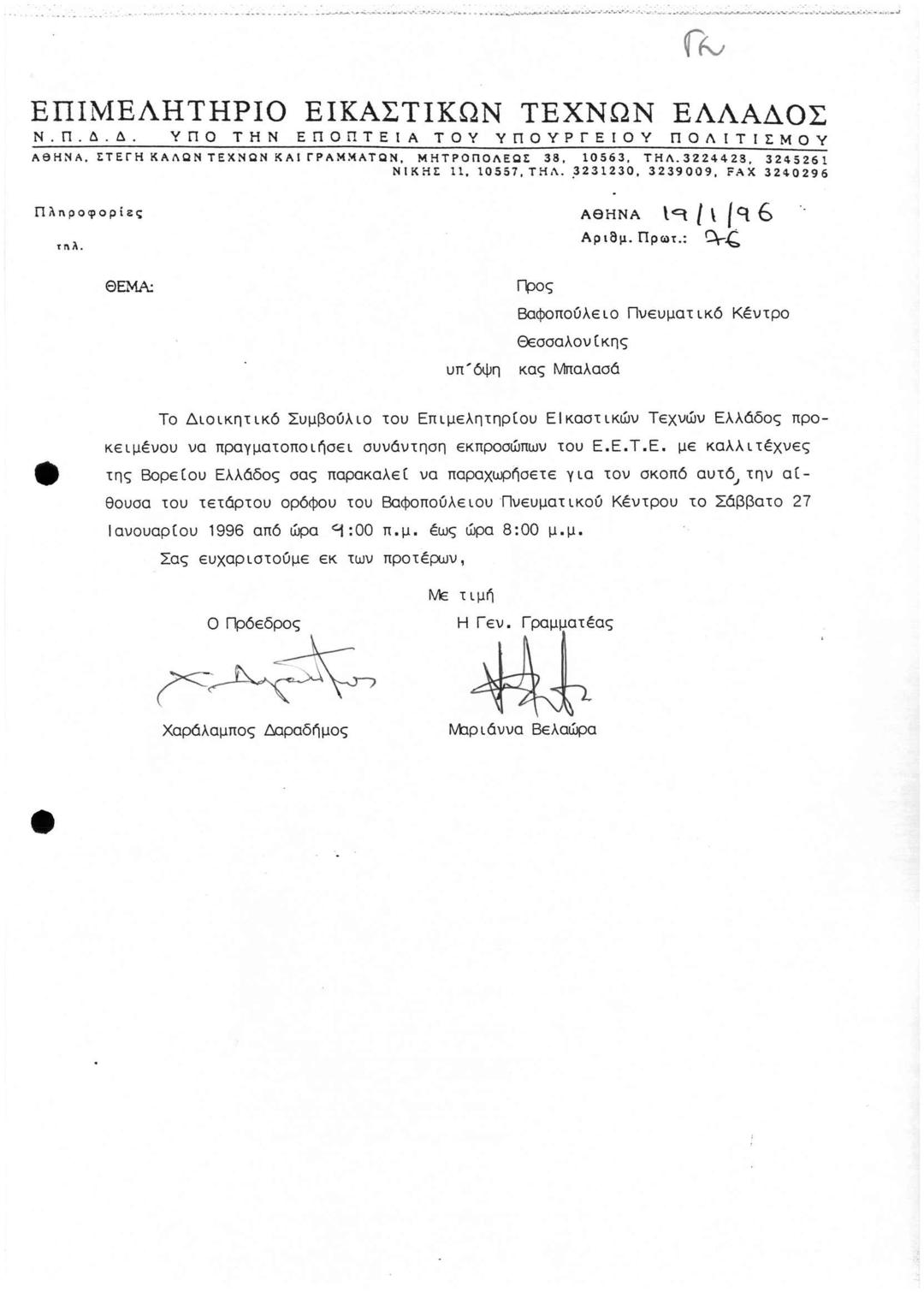 Περι Αιτήματος Παραχώρησης Αίθουσας του Βαφοπούλειου Πνευματικού Κέντρου για Συνάντηση Εκπροσώπων του ΕΕΤΕ με Καλλιτέχνες της Βορείου Ελλάδος